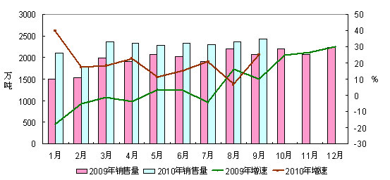 (二)电力供应能力继续增强,电力消费快速增长后稳步回落。前三季度,全国电源新增生产能力5186万千瓦,比上年同期多投产274万千瓦。9月末,全口径电力装机规模超过9亿千瓦。年初,全社会用电量延续去年四季度以来快速增长势头。二季度,在推进结构调整、加大节能减排措施影响下,重工业用电量开始回稳,全社会用电增速放缓。三季度,宏观调控措施的效果进一步显现,重工业用电增速回落。9月,重工业用电量1939亿千瓦时,环比下降17.3%;当月全社会用电量3498亿千瓦时,环比下降12%,回落幅度高于上年同期5个百分点。