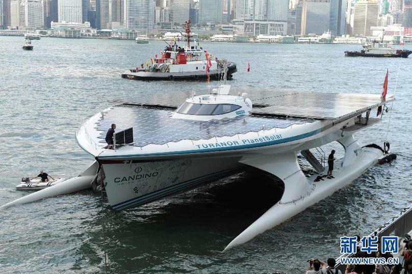 8月15日,全太阳能动力双体船MS Turanor PlanetSolar停靠香港维多利亚港湾。 当日,全太阳能动力双体船MS Turanor PlanetSolar抵达香港海港城海运大厦,作为该太阳能船只首次环球航行其中一站。 据悉,MS Turanor PlanetSolar是长达31米的双体船,铺设了500平方米的太阳能电板。该艘双体船于2010年9月从法国南部出发,展开环球航行。抵达香港前,该船已横渡大西洋及太平洋,访问了美国、墨西哥、巴拿马、哥伦比亚、厄瓜多尔、澳大利亚及菲律宾等国家。此船将在香港停泊至23日。新华社记者 宋振平 摄 |