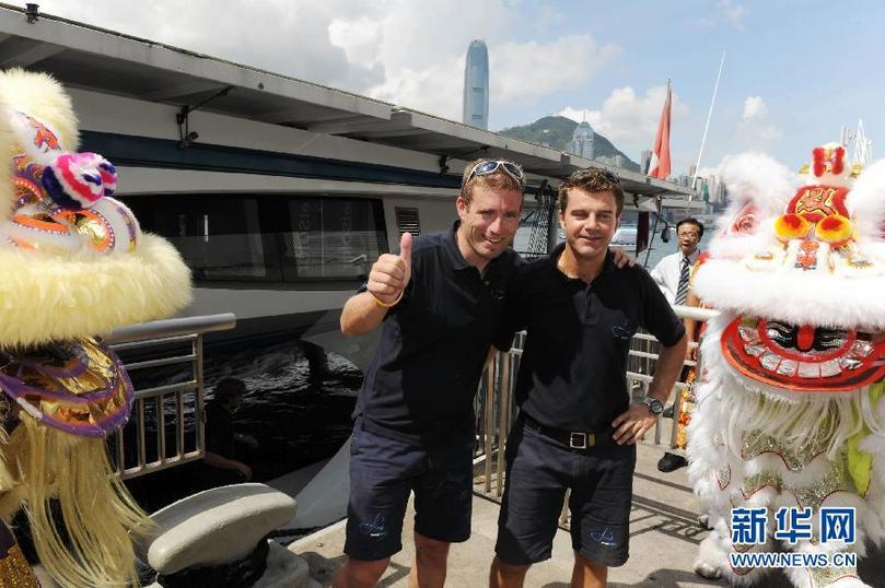 8月15日,瑞士著名探险家Raphael Domjan(左)及船长 Erwann Le Rouzic登陆上岸。新华社记者 宋振平 摄