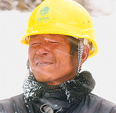 在西藏拉萨林周县藏雄村海拔4700多米的施工现场,大风刮着大雪让人睁不开眼睛。