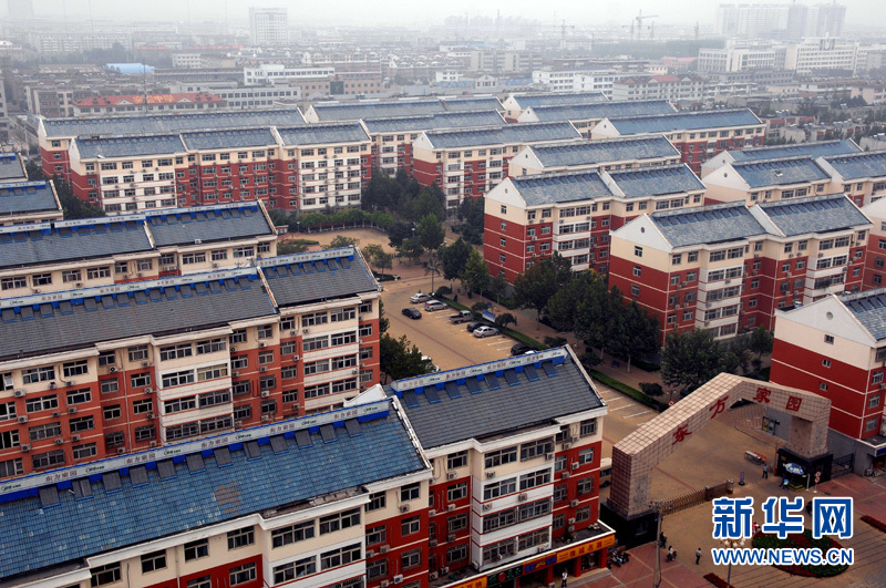 在德州市东方家园,太阳能入户应用统一规划、同步设计、同步施工,成为一道城市景观(9月13日摄)。山东省德州市依托太阳能热利用良好的产业基础,积极推动太阳能应用与建筑一体化,将住宅小区建筑工程应用太阳能技术作为建设审批程序和施工图审查的必备条件,通过实施“百万屋顶”计划和“千村浴室”工程,推动太阳能在能源、交通、建筑、公共设施等领域广泛应用,让更多的老百姓感受到阳光的温暖。目前,德州市区新建建筑太阳能建筑一体化应用达95%,全市城镇住宅小区达50%。新华社记者 郭绪雷摄 |