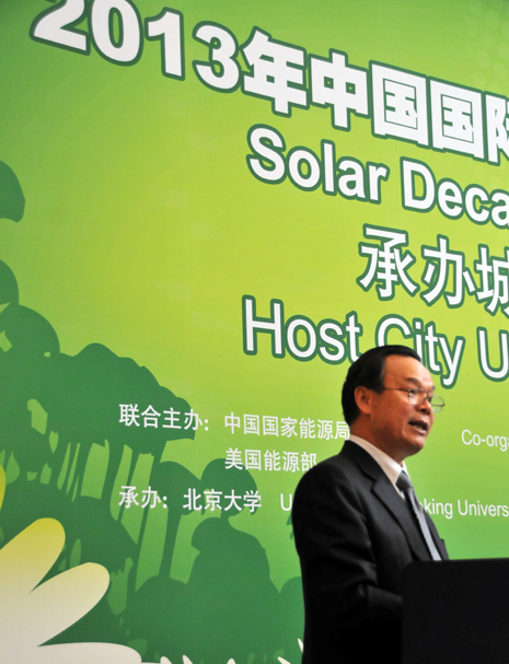 2011年9月21日,由国家能源局与美国能源部联合主办、北京大学承办的“2013年中国国际太阳能十项全能竞赛承办城市发布仪式”在北京钓鱼台国宾馆举办。国家发展改革委副主任、国家能源局局长刘铁男宣布山西省大同市为2013年中国首届SD竞赛的承办城市并举行授牌仪式。图为竞赛承办方北京大学校长周其凤致辞。赵丹摄 |