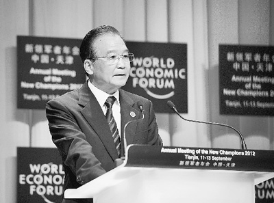 奋力开创中国经济更加光明的未来 ——在二〇一二年夏季达沃斯论坛上的致辞 中华人民共和国国务院总理 温家宝 (二〇一二年九月十一日) 九月十一日,世界经济论坛二〇一二年新领军者年会(第六届夏季达沃斯论坛)在天津梅江会展中心开幕,中共中央政治局常委、国务院总理温家宝出席开幕式并致辞。新华社记者 黄敬文摄 尊敬的克劳斯·施瓦布主席, 女士们,先生们: 今天在这里与新老朋友相聚,我感到非常高兴!首先对第六届夏季达沃斯论坛的召开表示热烈祝贺!对各位嘉宾的到来表示诚挚欢迎! 夏季达沃斯论坛2007年在中国首次举办,迄今已经走过六个年头,成为具有广泛国际影响力的世界性论坛。本次论坛以“塑造未来经济”为主题,反映了大家对推动可持续发展的远见卓识,对开创世界经济光明未来的迫切期待,具有很强的针对性和重要的现实意义。 中国经济实现了长达30多年的快速发展。特别是过去十年,我们紧紧抓住和用好国家发展的重要战略机遇期,奋力拼搏,开拓进取,经济社会发展实现了新的历史性跨越。2002年到2011年,国内生产总值年均增长10.7%,从世界第六位上升到第二位,人均国内生产总值由1000多美元提高到5432美元,对外贸易总额由世界第六位上升到第二位,外汇储备超过3万亿美元;产业结构优化升级,农业基础进一步巩固,区域发展协调性明显增强;各项社会事业全面发展,人民生活显著改善。我们经受住了许多灾害、困难和风险的考验,特别是近五年,有效应对国际金融危机的巨大冲击,保持了经济平稳较快发展。所有这一切都源于改革开放的伟大力量和中华民族自强不息的伟大精神;源于推动科学发展、构建和谐社会的不懈探索和努力。这里我愿意向大家谈谈我们的一些做法和体会。 ——坚持加强和改善宏观调控,着力促进经济平稳较快发展。这十年,中国经济运行的一个最突出特点,是经济增长速度快、波动幅度比较小。我们充分发挥市场在资源配置中的基础性作用,科学运用宏观调控手段,及时纠正市场失灵,防止经济出现大的起落。特别是国际金融危机爆发后,我们把扩大国内需求和稳定外需结合起来,把增加投资和刺激消费结合起来,把调整振兴产业和推动科技创新结合起来,把拉动经济增长和保障改善民生结合起来,把克服当前困难和促进长远发展结合起来,全面实施一揽子计划,在世界率先实现经济回升向好,也为全球经济走向复苏发挥了至关重要的作用。对于我们应对危机的一揽子计划,有人不顾事实地歪曲和指责,甚至说是不必要的代价。我想郑重地说明,正是因为当时的果断决策和科学应对,我们才避免了企业倒闭、工人失业、农民返乡,继续保持了中国经济发展的好势头,维护了社会和谐稳定,防止了现代化进程出现大的波折。这些年,社会财富不断增加,资产质量不断提高,抗风险能力不断增强。2009年至2011年底,我国城镇保障房开工建设2100多万套,基本建成1100万套;新增铁路营业里程1.35万公里,新增公路里程37.6万公里,其中高速公路2.46万公里;城市轨道交通、农村电网线路等基础设施明显改善,完成了7000多座大中型和重点小型水库除险加固;解决了大量农村人口饮水安全问题;建成一大批基层医疗卫生教育文化服务设施;一个新的汶川拔地而起,灾区经济社会发展实现了整体性跨越。同时,我们比较好地控制了财政金融风险。2011年财政赤字和国债余额占国内生产总值的比重分别为1.8%和15.28%,低于2002年的2.57%和16.07%;银行业金融机构不良贷款率从2003年底的15.2%下降到2011年底的1.8%;我们摸清了地方政府性债务情况,这两年,地方政府性债务规模总体稳定,风险总体可控。 ——坚持调整和优化经济结构,着力提高经济发展的质量和效益。这十年,中国发展导向的一个根本性变化,是从“快字当头”转为“好字优先”。我们把经济结构战略性调整作为转变发展方式的主攻方向,提高了发展质量,拓展了发展空间,增强了发展后劲。我们坚持内需外需均衡发展,实施一系列扩大内需的政策措施,经常账户顺差占国内生产总值的比重降低到2.8%,最终消费对经济增长的贡献率由43.9%提高到50.8%,消费、投资、出口协同拉动经济增长的格局正在形成。坚持创新驱动,制定实施科技、教育、人才中长期发展规划纲要,全国研究与试验发展经费支出占国内生产总值的比重由1.23%提高到1.83%,专利授权量增加18.2倍,企业已经成为投入和研发的主体。推动经济增长向依靠第一、第二、第三产业协同带动转变,农业综合生产能力不断提高,粮食产量实现历史性的“八连增”,粮食储备超过5000亿斤,是历史最高水平;制造业规模跃居全球首位,高技术制造业总产值年均增长22%,成为国民经济重要的先导性、支柱性产业;服务业增加值占国内生产总值比重提高1.6个百分点,特别是金融保险、现代物流、软件信息等现代服务业实现跨越发展。推动工业化、城镇化、农业现代化同步发展,实施区域发展总体战略,初步扭转了工农差别、城乡差别、地区差别扩大的趋势。城镇化率由39.1%提高到51.3%,实现了城乡结构的历史性变化。2008年以来,中部、西部、东北地区经济增速持续超过东部地区,地区生产总值占全国比重明显提高,各具特色、良性互动的区域发展格局正在形成。 ——坚持节约资源和保护环境,着力增强可持续发展能力。这十年,中国践行可持续发展理念的一个