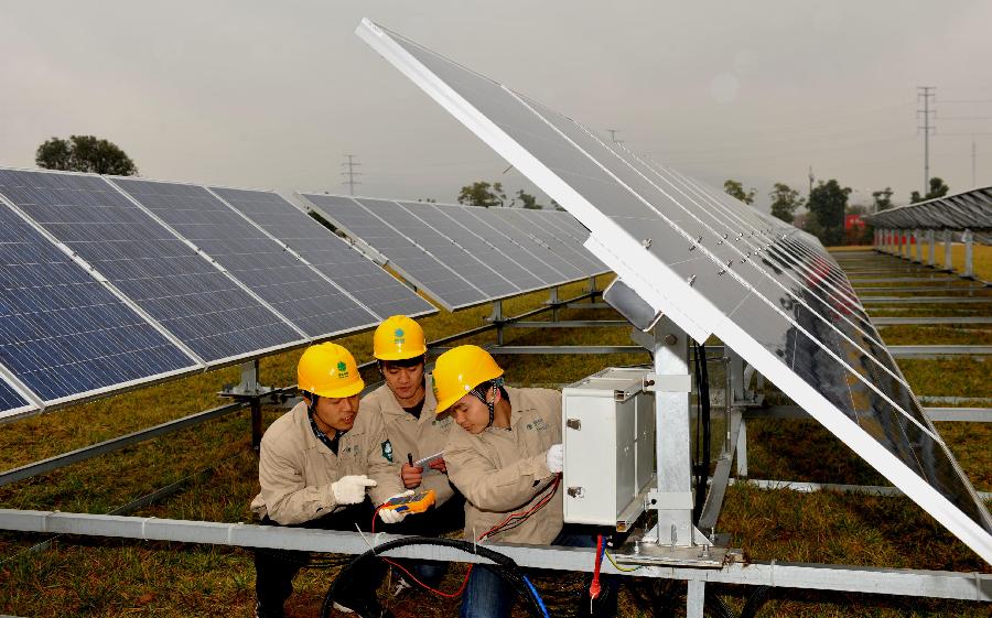 12月27日,工程技术人员在实验室的风光储一体化发电系统的光伏电站进行低光照下组件性能检测。 近日,江苏省电力公司新能源及智能配网实验室在南京市江宁区建成并完成调试。该实验室可对风能、光能等新能源发电的电能进行智能分配,实现新能源电网与其它电网的协调互动,可满足江苏光伏、风电等新能源电网快速发展的技术服务需求。此外,实验室还配有风光储一体化发电系统、电动汽车充电系统等,可依托实验平台加速研究智能配电网的前沿技术问题。 新华社发(濮良平 摄) |