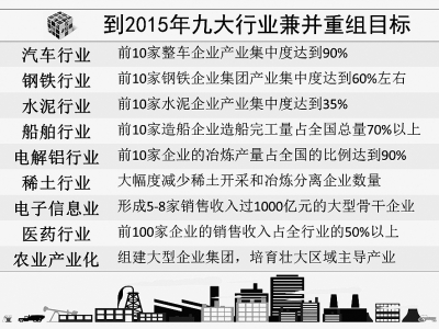 制表:陈恒 近日,工信部、发改委、财政部等12部委联合发布了《关于加快重点行业企业兼并重组的指导意见》,涉及汽车、钢铁、水泥、船舶、电解铝、稀土、电子信息、医药、农业产业化龙头企业九大行业,明确了到2015年的行业集中度目标。这预示着,在接下来的两年时间里,九大行业将掀起兼并重组潮。 一方面,这九大行业都是国民经济的支柱行业,规模经济效益显著,是名副其实的“大块头”:2012年中国粗钢产量7.17亿吨,再次创下历史新高,占世界总产量的46.3%;水泥产量21.84亿吨,同比增长7.4%,约占世界总产量的60%;电解铝1565万吨,占世界总量65%;汽车产量2059.7万辆,同比增长6.3%,连续4年蝉联世界第一,占世界总产量的四分之一以上…… 另一方面,这九大行业都有大而不强的“虚胖”病,组织结构不合理,产业集中度过于分散,社会化、专业化程度较低,产能严重过剩:以钢铁行业为例,2012年理论产能9.2亿吨,实际产能只利用了近7.2亿吨,产能过剩高达2.4亿吨。2.4亿吨的过剩产能,大于全球钢产量第二名日本和第三名美国的产量总和。 兼并重组,能否治好九大行业“虚胖”病? 产能过剩成“绊脚石” 政策解读:以产业结构调整为主线,以规模效益显著的行业为重点,提高产业集中度和资源配置效率,增强国际竞争力,推动重点行业健康有序发展,加快经济结构调整和发展方式转变。 近年来,国际经济形势复杂多变,外部需求减弱,国内经济增速放缓,行业虚胖,产能过剩不仅成为阻碍中国经济复苏的巨大挑战,也是阻碍行业回暖的最大“绊脚石”。 中钢协秘书长张长富说:“2012年的钢铁工业总体上是高成本、高产能,低增长、低效益’的局面。”统计显示,2012年1-9月钢铁企业亏损额达到267.26亿元,同比增长41.5倍,亏损面达到45%,其中产能过剩对此“贡献”不小。 国务院发展研究中心产业经济研究部部长冯飞表示,当前产能过剩出现了新特点:除了具有普遍性,表现为传统产业和部分战略性新兴产业都存在产能过剩问题,还表现为部分行业出现了绝对过剩。未来几年,有些产品可能出现消费峰值。比如,我国峰铁的消费钢值在7.5亿吨到8亿吨左右,去年的钢铁产能达9亿多吨,在建规模1.5亿吨。相比需求,钢铁行业的过剩是绝对过剩。 此外,统计数据显示,2012年水泥产能过剩超过3亿吨,有色金属的产能利用率已由2007年的90%降至65%左右。 产能过剩,简单地说就是供给大于需求。要控制产能,就意味着企业开工率和设备利用率过低,摊到吨钢上的还贷本息和固定资产折旧过高。专家表示,这“一低一高”容易造成三大突出危害:一是企业吨钢成本畸高,正常利润空间大多被过剩产能吞噬,从而加剧行业内企业“糊口型恶性竞争”;二是企业无钱进行产业升级和新产品开发,为维持现有市场份额只能大打“自杀式价格战”;三是员工薪酬福利严重缩水甚至多年原地踏步,久而久之企业人心涣散。 最近几年,政府大力治理产能过剩,决心不可谓不大,但是收效甚微。这些行业产能严重过剩的硬伤,迫切需要通过一次刮骨疗毒式的兼并重组潮来缓解,以推动中国从“制造大国”向“制造强国”艰难转身。 兼并重组并非“大吃小” 政策解读:通过兼并重组,整合行业资源,最终形成一批顶天立地的大企业和铺天盖地的中小企业,形成大中小企业协调发展的最佳企业生态。 长期以来,产业集中度高低与否一直是衡量行业发展程度的重要指标。以钢铁产业为例,美国、日本等发达国家产能的60%乃至70%以上都集中在几家优势企业。中国的钢铁产量虽然多年列居世界第一,但宝钢、鞍钢、首钢和武钢四大集团销售额的总和,只有日本新日铁的63%。 工信部总工程师、企业兼并重组工作部际协调小组成员、办公室主任朱宏任对记者说,九大行业有一个共同特征,即规模经济效益显著,但目前这些行业的组织结构不尽合理,产业集中度不高,企业小而分散,社会化、专业化水平较低,缺乏能引领行业健康发展的大企业,从而容易引发重复建设、恶性竞争等突出问题。 并购应在平等的前提下进行,不一定就是“大吃小”。社科院工业经济研究所所长金碚表示,一般来讲,在产业链上游的一些规模经济明显的领域,提高大企业集中度,有利于促进产业国际竞争力的提高。但在一些直接面对市场,或者为大企业提供配件的领域,应依靠小微企业的发展来维护市场竞争活力。 这次发布的加快重点行业企业兼并重组的指导意见,将结合行业自身特点和企业实际情况实行分类指导,促进各种所有制企业公平竞争和优胜劣汰,促进大中小企业协调发展,形成结构合理、有效竞争、规范有序的市场格局。 金碚表示,推动大企业兼并重组,提高部分行业的产业集中度,支持企业做大、做强是下一阶段工作的重要目标。同时,也要把改善企业发展环境、积极发展民营经济作为增强经济活力的重要方面。 从2012年资本市场看,前11个月中国并购市场共完成2199宗并购交易,交易总金额达4022亿元。尽管交易数量持续小幅度下滑,但交易金额呈现出上升趋势。“交易金额增大,案例减少,说明兼并重组的力度在加大,效果在显现。”朱宏任说。 政府不能“拉郎配” 政策解读:完善相关行业规划和政策措施,努力营造有利于企业兼并重组的政策环境;完善企业兼并重组服务管理体系,努力消除制约企业兼并重组的体制机制障碍,规范行政行为。 毫无疑问,在经济