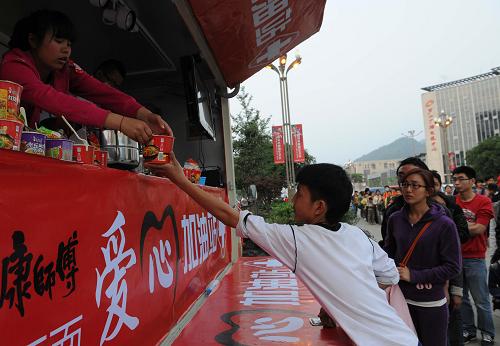 4月22日,受灾群众在排队领取冲泡好的方便面。芦山县中心区域停放着一辆食品专用车在用“爱心”为受灾群众“加油”,工作人员把冲泡好的方便面向排队的群众逐一发放,当日累计发放了1000多份方便面。新华社记者陈树根摄