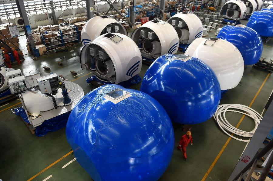 这是河北金风电控设备有限公司的风力发电机组机舱组装车间(4月17日摄)。近几年,随着产业政策的调整和工作力度的加大,河北省承德市以风能、水能、太阳能、生物质能、地热能为重点的清洁能源产业发展迅速。2013年,全市新能源产业实现产值近百亿元,新能源电力总装机达到218.94万千瓦、发电量达到43.48亿千瓦时,分别占到全市电力总装机量和发电量的67.3%和42%。今年1-3月份,清洁能源发电量达到13.1亿千瓦时。新华社记者金良快摄 |