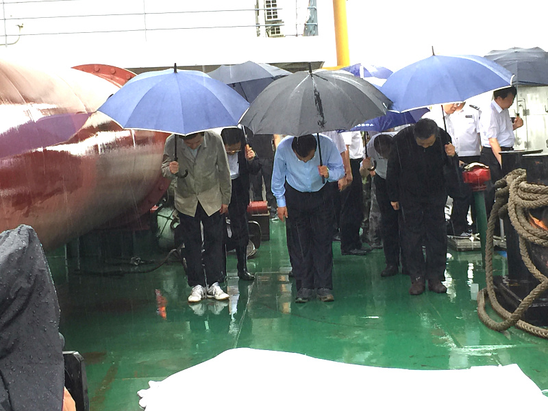 3日上午,李克强总理再次来到客船翻沉事件救援现场。在大雨中,总理及随行人员向遇难者遗体三鞠躬并默哀。