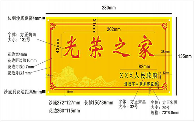国办发〔2018〕72号 各省、自治区、直辖市人民政府,退役军人事务部: 《为烈属、军属和退役军人等家庭悬挂光荣牌工作实施办法》已经国务院同意,现印发给你们,请认真贯彻执行。 悬挂光荣牌是落实中央决策部署、弘扬拥军优属优良传统、推进军人荣誉体系建设的重要举措。各地区要牢固树立“四个意识”,充分认识做好悬挂光荣牌工作的重要意义,切实加强组织领导,建立工作机制,列支相关经费,周密安排部署,精心组织实施,确保悬挂光荣牌对象准确、档案齐全。各地区要于2019年5月1日前完成为既有全部对象悬挂光荣牌的任务,并将有关情况报送退役军人事务部。 国务院办公厅 2018年7月29日 (此件公开发布) 为烈属、军属和退役军人等家庭 悬挂光荣牌工作实施办法 第一条 为做好悬挂光荣牌工作,弘扬拥军优属优良传统,营造爱国拥军、尊崇军人的浓厚社会氛围,推进军人荣誉体系建设,依据《烈士褒扬条例》、《军人抚恤优待条例》等有关法规政策,制定本办法。 第二条 本办法的适用对象是烈士遗属、因公牺牲军人遗属、病故军人遗属(以下统称“三属”)家庭和中国人民解放军现役军人(以下简称现役军人)家庭、退役军人家庭。 主动为持《中华人民共和国烈士证明书》、《中华人民共和国军人因公牺牲证明书》、《中华人民共和国军人病故证明书》的“三属”家庭和现役军人家庭、退役军人家庭悬挂光荣牌。对于非持证的烈士、因公牺牲军人、病故军人的父母(抚养人)、配偶和子女家庭,依申请悬挂光荣牌。 同时具备两个以上悬挂光荣牌条件的家庭,只悬挂一个光荣牌。 第三条 光荣牌称号统一为“光荣之家”。 第四条 悬挂光荣牌工作坚持彰显荣誉、规范有序、分级负责、属地落实的原则。 第五条 退役军人事务部统一设计和规范光荣牌的样式、监督光荣牌制作,光荣牌落款为省(自治区、直辖市)人民政府、新疆生产建设兵团。 省级人民政府退役军人事务主管部门负责本省份光荣牌的统一制作。 县级人民政府退役军人事务主管部门会同当地人民武装部门组织落实本行政区域内光荣牌的具体悬挂工作。 第六条 光荣牌的悬挂位置应尊重悬挂家庭的意愿,一般悬挂在其大门适当位置,保证醒目、协调、庄严、得体。 因建筑结构、材质等因素不适合悬挂的,可在客厅醒目位置摆放。 第七条 悬挂光荣牌的对象居住地或户籍所在地改变,或发生光荣牌老化破损等情形,可申请更换光荣牌。 现役军人退出现役或去世后,其家庭继续悬挂光荣牌。 悬挂光荣牌家庭的“三属”或退役军人去世后,该家庭可继续悬挂光荣牌,但不再更换。 第八条 悬挂、更换光荣牌工作原则上于每年建军节或春节前进行。 集中悬挂或更换光荣牌时,村(居)民委员会或社区应举行悬挂仪式,安排专人负责安装悬挂。悬挂仪式应简朴、庄重、热烈。 第九条 悬挂光荣牌对象及其家庭成员依法被判处刑事处罚或被公安机关处以治安管理处罚且产生恶劣影响的,现役军人被除名、开除军籍的,取消其家庭悬挂光荣牌资格,已悬挂的由县级人民政府退役军人事务主管部门负责收回。 被公安机关处以治安管理处罚后能够主动改正错误、积极消除负面影响的,经县级人民政府退役军人事务主管部门审核同意,可以恢复悬挂光荣牌。 第十条 省级人民政府退役军人事务主管部门要加强对悬挂光荣牌工作的指导和检查督促,对工作不及时、不到位的,要责令限期整改。退役军人事务部会同军地有关部门定期组织抽查,并通报情况。 第十一条 悬挂光荣牌工作列入全国和省级双拥模范城(县)创建考评内容,作为创建双拥模范城(县)的重要条件。 第十二条 县级人民政府退役军人事务主管部门要建立健全悬挂光荣牌工作建档立卡制度,汇总相关信息和统计数据,及时录入全国优抚信息管理系统,加强信息数据管理。 第十三条 各地区应结合悬挂光荣牌工作和本地实际,视情开展送年画春联、走访慰问和为立功现役军人家庭送立功喜报等活动。 第十四条 本办法适用于中国人民武装警察部队官兵家庭。 第十五条 本办法由退役军人事务部负责解释。 第十六条 本办法自印发之日起施行。本办法实施前已悬挂的光荣牌,原则上继续保留,需要更换时按照本办法办理。 附件:光荣牌设计和技术标准 附件 光荣牌设计和技术标准 光荣牌(式样图附后)材质为钛金牌,底色为金黄色、沙底镀金;规格为280毫米×135毫米,厚度1毫米;“光荣之家”字样为红色套亮金边,方正魏碑简体132号字,四个字规格为202毫米×43毫米,距上边31毫米,左右居中;“×××人民政府”字样为方正宋体黑色32号简体字,规格为82毫米×11毫米,距下边29毫米,距右边32毫米;左下角配长城图案、亮金色,规格为155毫米×36毫米,距下边15毫米,距左边16毫米;红色花边宽4毫米,距边缘10毫米,花边内线粗0.7毫米,花边外线粗1毫米。右下花边内“退役军人事务部监制”字样为方正宋体黑色20号字,规格为73毫米×6.8毫米,距下边16.5毫米,与“×××人民政府”右端对齐。