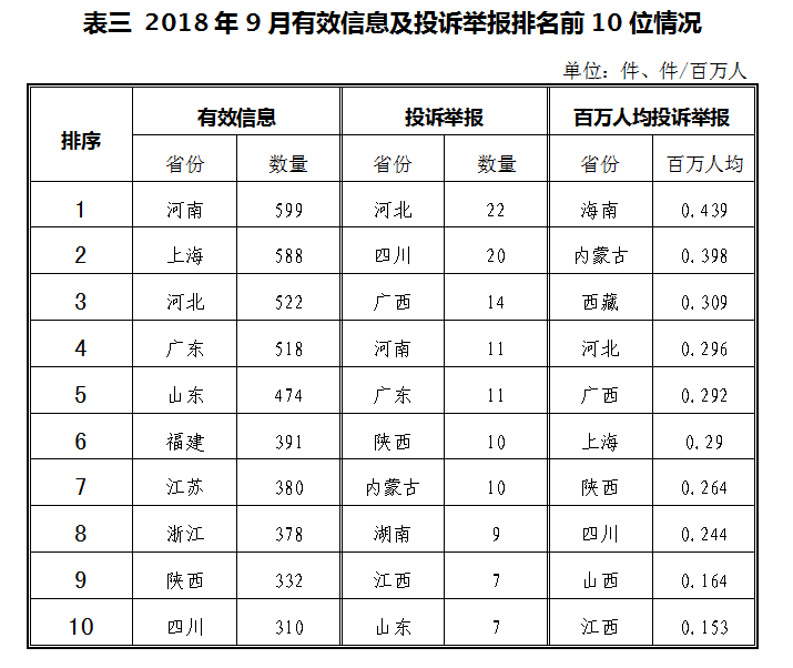 三、分布情况 各省(自治区、直辖市)按照收到的有效信息数量排序,河南、上海、河北、广东、山东等列全国前10位;按照投诉举报数量排序,河北、四川、广西、河南、广东等排在全国前10位。按照百万人均投诉举报数量排序,海南,内蒙古,西藏,河北,广西等排在全国前10位。(2018年9月有效信息及投诉举报排名前10位情况见表三)