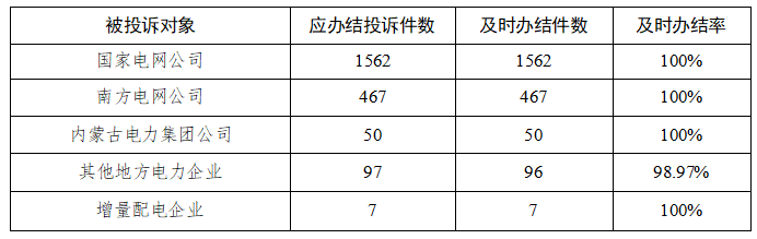 能源企业应在2026年1月份办结投诉2183件(含上月结转),及时办结2182件,及时办结率99.95%(详见表1)。