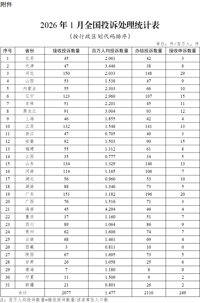 根据《12398能源监管热线投诉处理办法》和《12398能源监管热线举报处理办法》规定,现将2026年1月12398能源监管热线(以下简称“热线”)投诉举报处理情况通报如下。